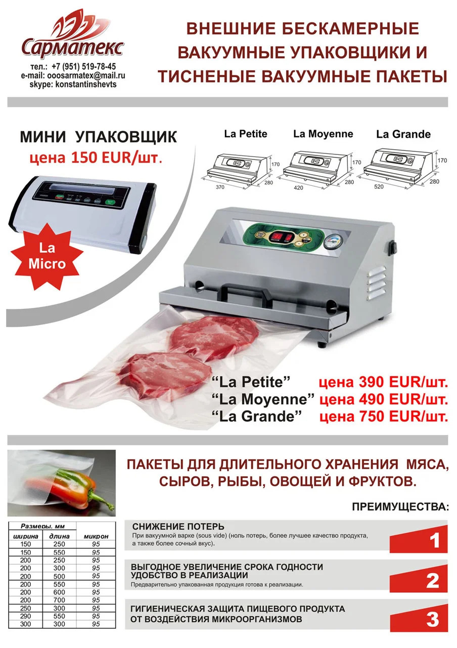 Полупрофессиональный бескамерный вакуумный упаковщик La Petite используется в быту, на небольших предприятиях общепита, кафе, ресторанах, гостиницах и торговых точках. Позволяет вакуумировать сырые и готовые продукты из мяса, птицы, рыбы, овощей и фруктов. Срок годности продуктов при этом увеличивается в 5 раз. Откачивание воздуха происходит непосредственно из пакета, что позволяет упаковывать крупноразмерные продукты. Устройство простое в использовании, занимает мало места и не требует больших инвестиций. С его помощью Вы можете повысить гигиену Вашего предприятия, увеличить сроки годности и сохранность пищевых продуктов. Бескамерный вакуумный упаковщик La Petite в отличии от камерных упаковщиков совершенно не требует дорогостоящего сервисного обслуживания.